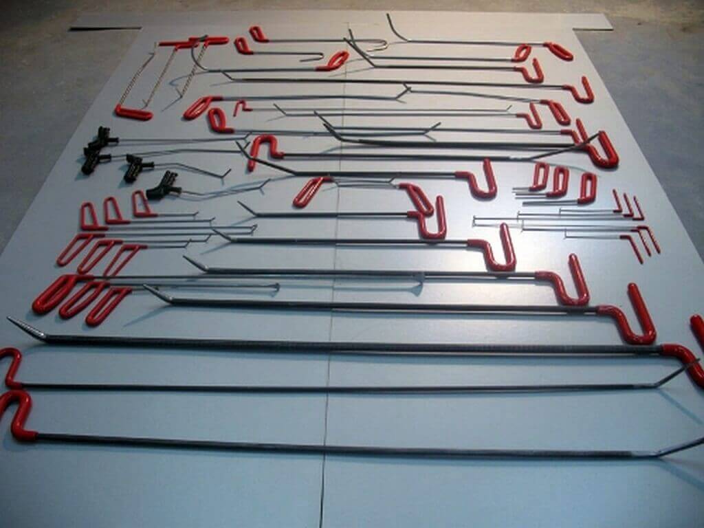 Вмятины на машине исправляются при помощи специальных крючков. Путем надавливания на места повреждения металл выпрямляется. Выглядит набор PDR примерно таким образом: