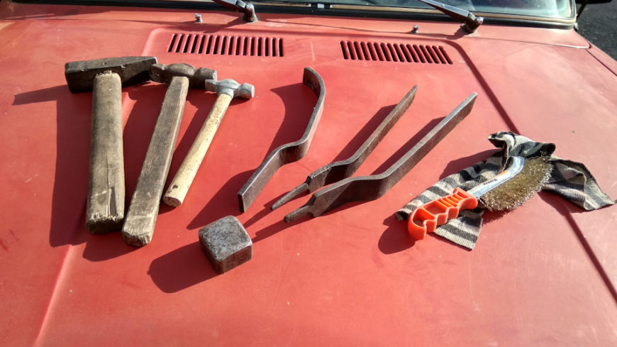 - наковальни, поддержки, подкладки. Дополнительная, но очень важная компонента, используемая для фиксации обратной стороны рихтуемого участка. Наилучшие результаты получаются, если геометрия таких инструментов соответствует изгибам выравниваемой детали, так что у профессионального рихтовщика таких приспособлений много. Используются для исправления дефектов тех же кузовных элементов, что и в случае с молотками;