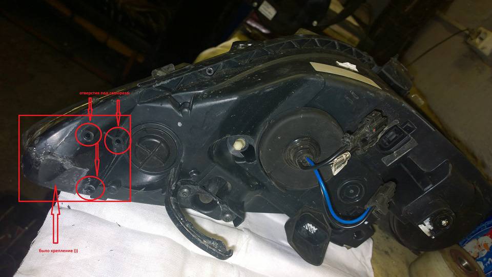На головной оптике используется преимущественно литой тип крепления. От корпуса фары отходит жесткое пластмассовое ушко, которое с помощью шурупа прикручивается к кузову. Фиксатор может быть и металлическим.