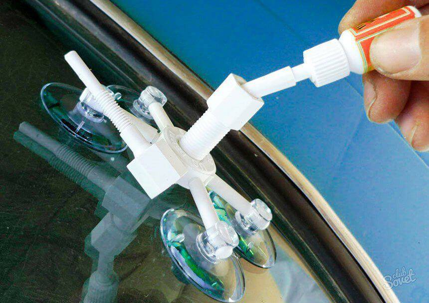 Как на лобовом стекле заделать трещину? На поверхность устанавливается инжектор. Крепить его следует специальными аппликаторами. Чтобы кружочки надежно были прикреплены к стеклу, рекомендуется смазать их вазелином. Следите за тем, чтобы инжектор находился перпендикулярно к стеклу и по центру выщерблины или трещины. После правильно установки инжектора можно вливать фотополимерный клей.