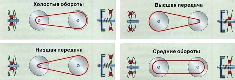 За счёт такой синхронной работы шкивов набор скорости происходит на постоянных оборотах и максимальной мощности двигателя.