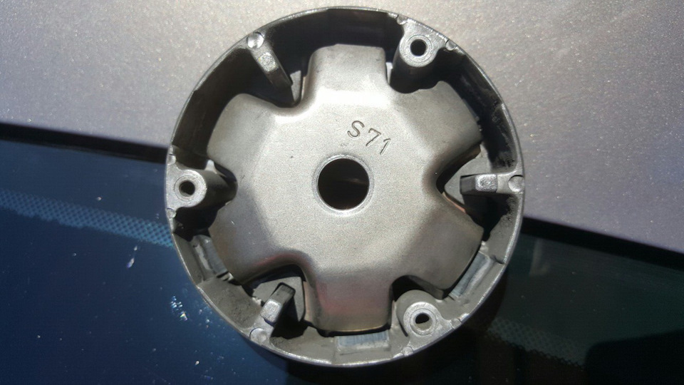 На площадке сцепления есть три отверстия в которые мы вставляем штифты съемника, второй рукой берем подходящий рожковый ключ и откручиваем центральную гайку (резьба правая).