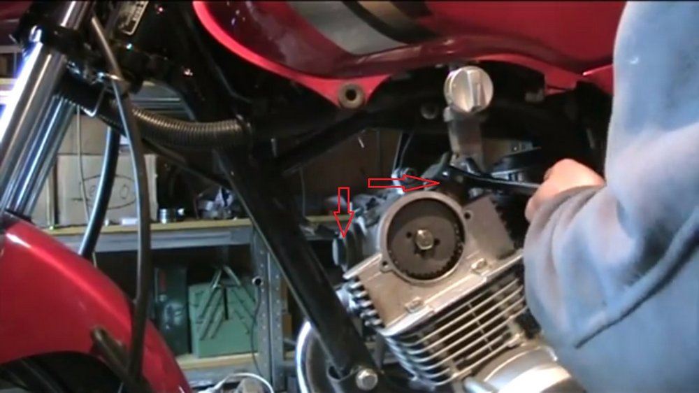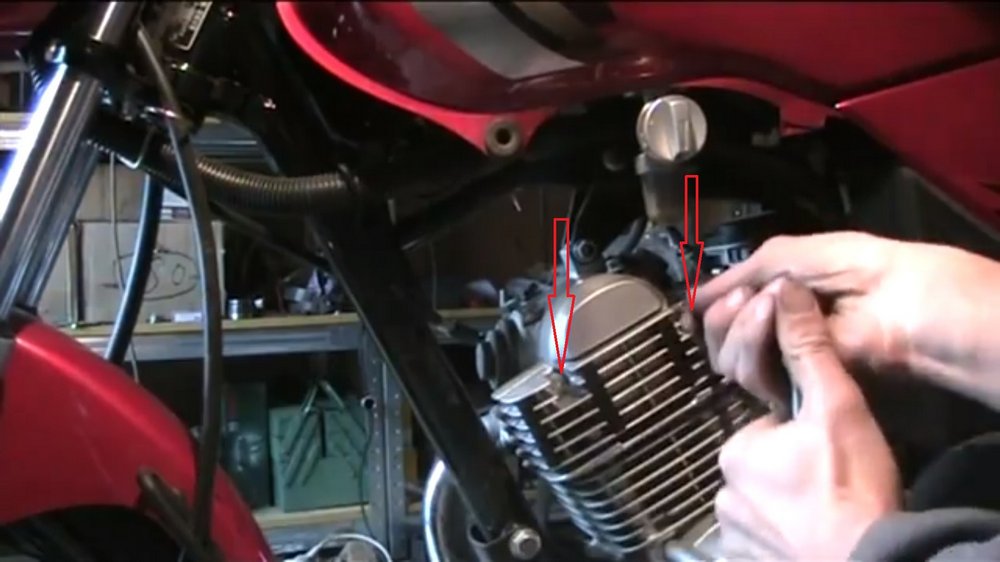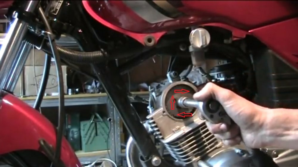 Теперь нужно выставить клапана в закрытое положение. Для этого включаем нейтраль и поворачиваем звезду до совпадения меток на звезде и головке. Для этого вращаем за болт ключом на 17 по часовой стрелке, иначе сломаем натяжитель цепи газораспределительного механизма: