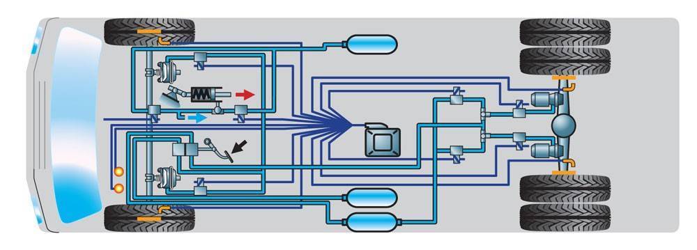 На легковых машинах они не применяются. По особенностям работы система имеет много общего с гидравлической с той разницей, что главным рабочим элементом является не жидкость, а воздух, поступающий под давлением с помощью компрессора.