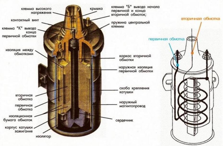 Наипростейшие катушки зажигания имеют две медные обмотки, которые насчитывают до 150 витков в первичной и до 30000 во вторичной. Они обе являются изолированными. Цель изоляции — предотвращение возникновения короткого замыкания. Их корпус очень похож на стакан с крышкой. На нее выведены контакты первичной обмотки. Вторичная обмотка находится внутри первичной. Один ее конец соединен с обмоткой низшего напряжения. Второй конец тоже выведен на крышку бобины. Его задача- подключение цепи, которая соединяет трансформатор со свечой. Внутри обмоток прячется железный сердечник. Его цель — увеличение силы, которая возникает внутри магнитного поля.