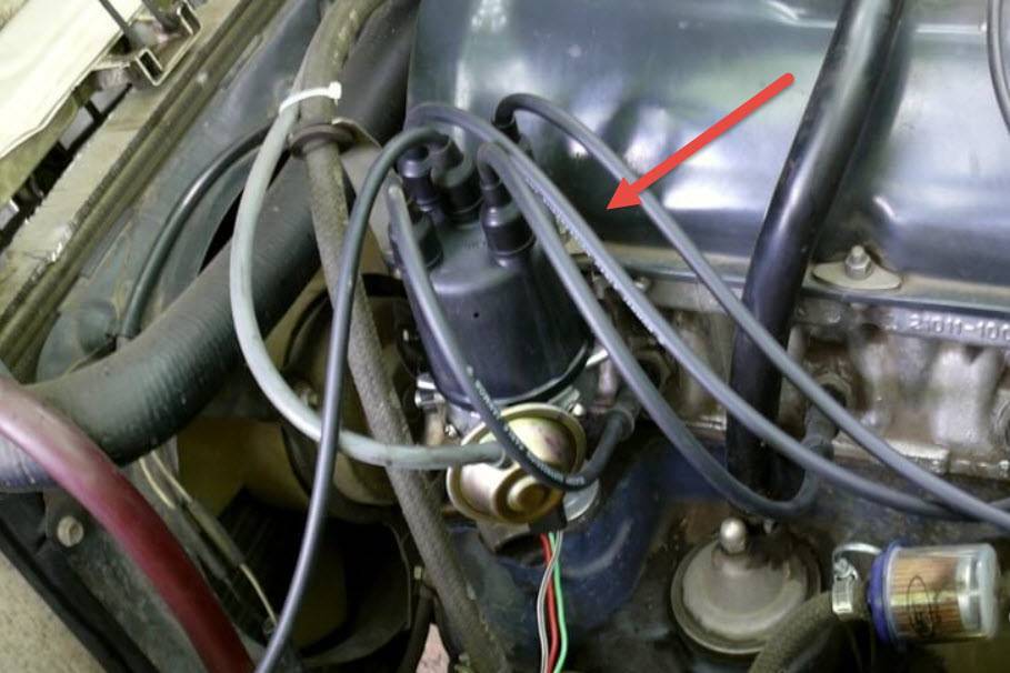 - Демонтируем крышку трамблёра и проверяем, чтобы наружный контакт был повернут в сторону 1-ого цилиндра мотора, а воображаемая линия между защёлками крышки распределителя параллельна оси двигателя. Если это не так, значит — требуется регулировка зазоров;