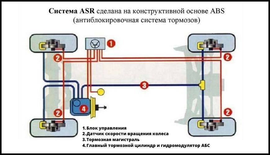 Система ASR автомобиля (также известная как система контроля тяги) предназначена для предотвращения чрезмерного буксования колес, например, при разгоне или трогании с места. Этот занос проявляется в раскручивании, которое известно всем водителям. Это второй способ повышения безопасности после АБС. Но не только. Система ASR также снижает износ шин и снижает количество потребляемого топлива.