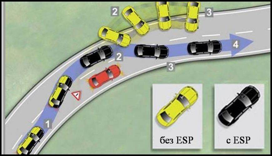 2. Система курсовой устойчивости (ESP, ESC, VSA и др.). Помогает сохранить или восстановить утерянный контроль над автомобилем при заносе. Система может изменять обороты двигателя и регулирует тормозное усилие индивидуально на каждом колесе автомобиля.