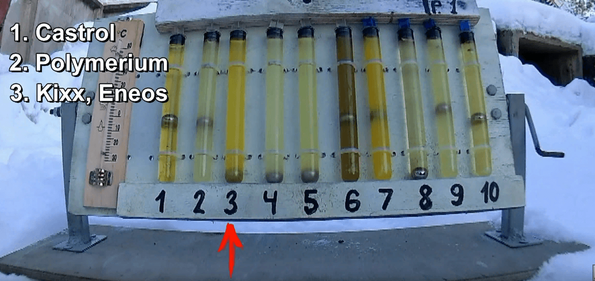 На холоде первый, как ни странно, Castrol, далее -Polymerium, за ним разом Kixx и ENEOS, остальные еле-еле догоняют.