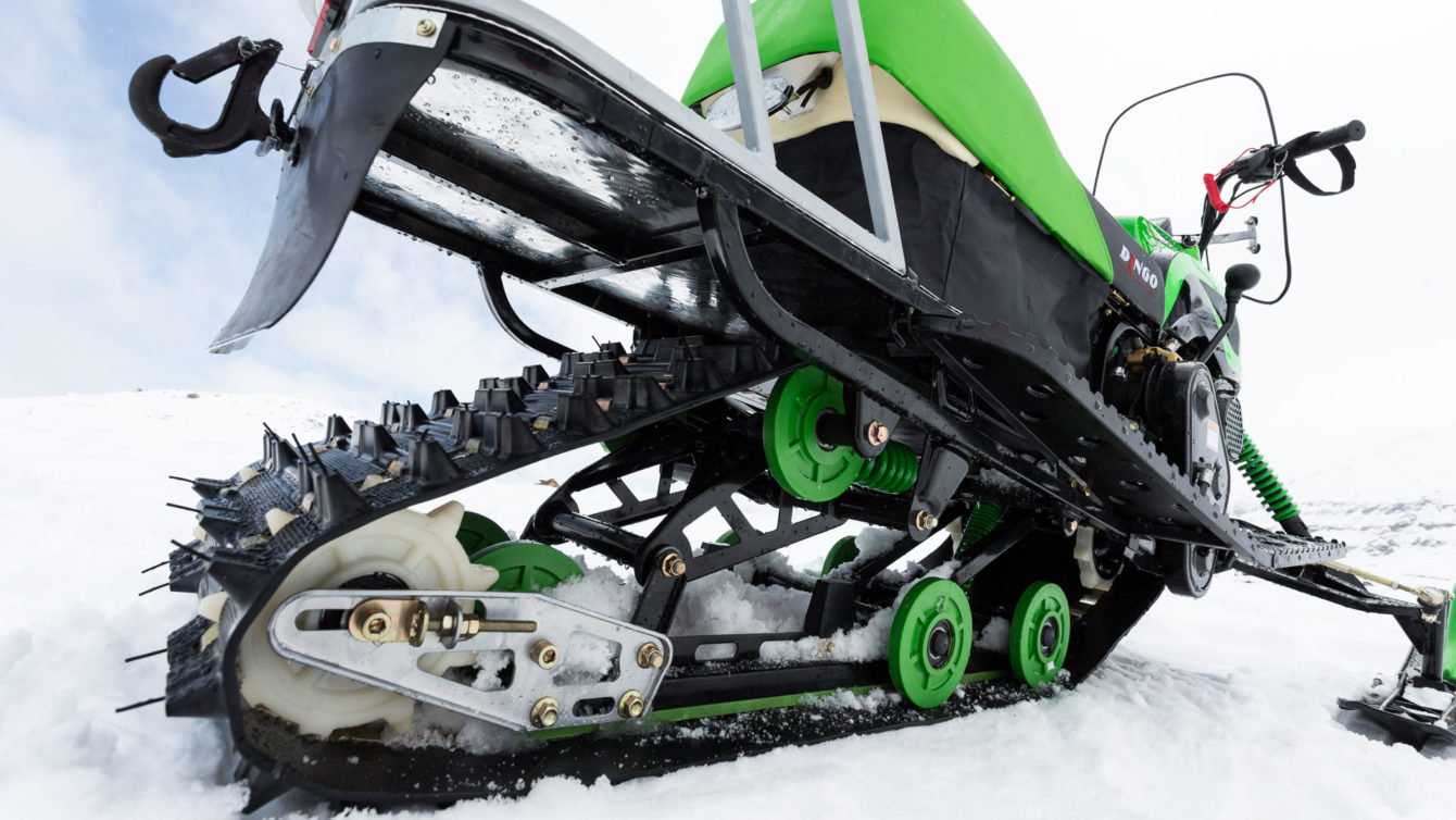 В основе удлиненной гусеницы армированная резиновая лента с зацепами, высотой 25 мм. Это конструктивное решение обеспечивает великолепную проходимость по рыхлому снегу, идеальную управляемость на накатанной трассе. Для передней подвески инженеры выбрали телескопическую вилку перевернутого типа с пружинным амортизатором. Поездка на снегоходе отличается высоким комфортом на высокой скорости.