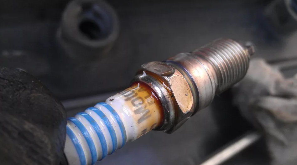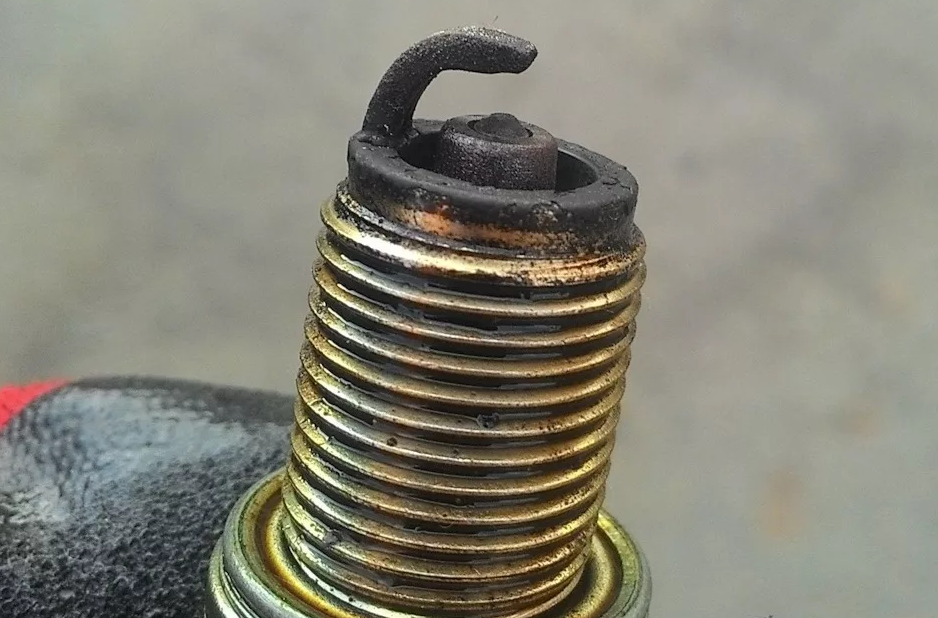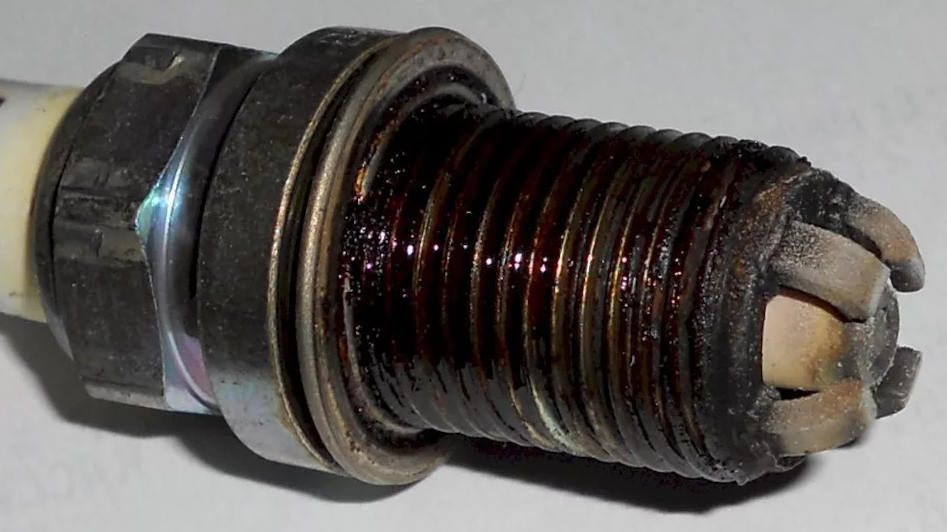 Электроды и резьбовая часть покрыта маслом. Причиной может служить попадание лишнего моторного масла в камеру сгорания. Масло может попасть из-за изношенных поршневых колец или маслосъмных колпачков, направляющих втулок клапанов. При этом запуск двигателя будет затруднен, возможны пропуски в работе цилиндров, сизый дым из глушителя (постоянно идет — проблемы с кольцами, при перегазовках — с колпачками), подергивания двигателя при работе. В такой ситуации необходим ремонт головки двигателя или его цилиндропоршневой группы. Виновника неисправности можно выявить, проведя замер компрессии в цилиндрах двигателя.