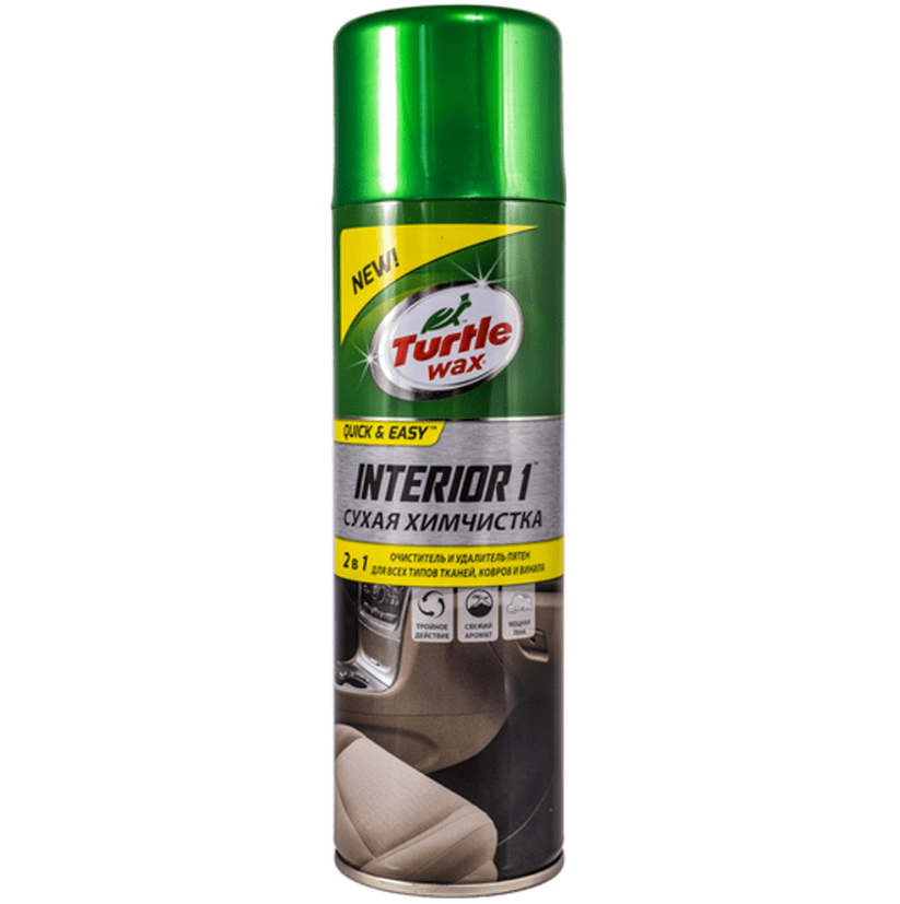 Это средство подходит в качестве промежуточного – т. е. перед профессиональным уходом. Turtle WAX Interior 1 хорошо справляется с салоном: пыль и грязь с обивки убирает на отлично. Рекомендуемые к чистке поверхности: винил, ткань, ковровые покрытия, Мощный очиститель легко удаляет жир, чернила и шоколад – по опыту тех, кто пользовался.