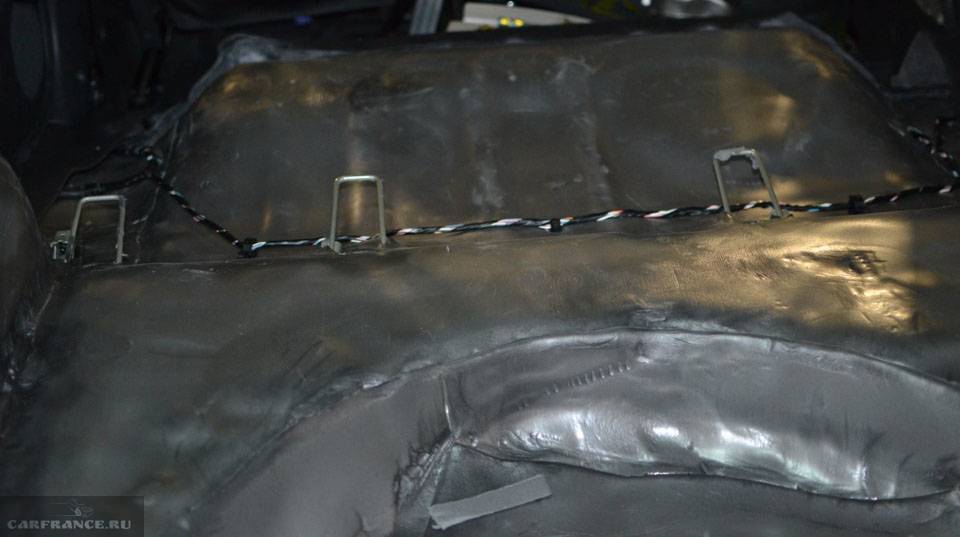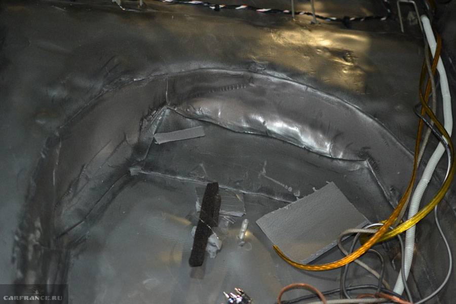 Вначале наклеивают виброизоляционный материал, особое внимание уделяют аркам и местам монтажа амортизаторов. Также оклеивают все большие поверхности, чтобы гасить звуки.