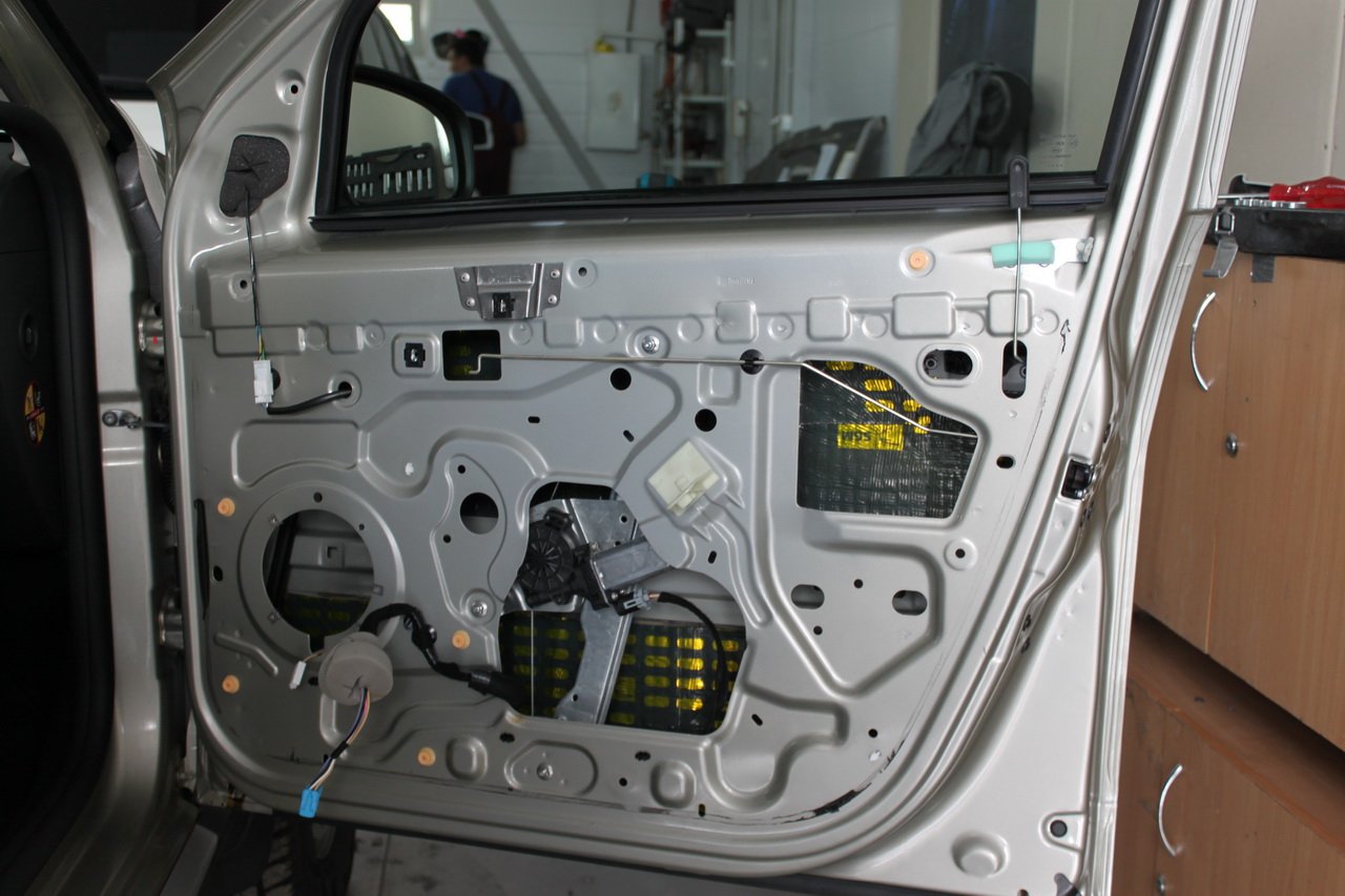 Двери наиболее подверженный шуму элемент, поскольку всё, что вылетает с передних колес, попадает именно сюда. Все грязь и твердые предметы ударяются о каркас, что создает посторонние звуки. Для того, чтобы установить шумку придется разобрать дверь. Как это сделать? Рассмотрим процесс: