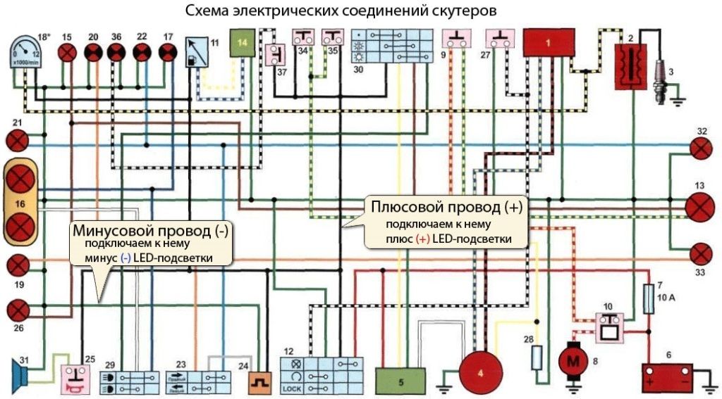 Подключить подсветку на мопед своими руками будет не сложно. Главное- определиться с цветом лампочек и типом их соединения. А дальше немного усилий и скутер заметно преобразится. Дополнительное подсвечивание скутера не запрещено в правилах дорожного движения, но и не разрешено. Все зависит от того, насколько ярким стал мотороллер, и какое настроение у инспекторов.