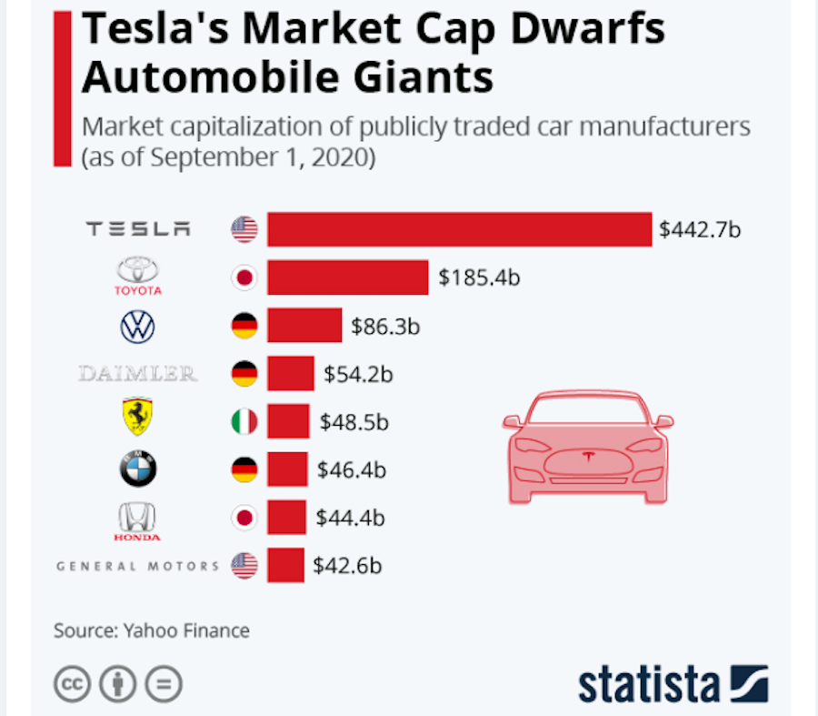 Рыночная капитализация Tesla и других автоконцернов на 1 сентября 2020 года