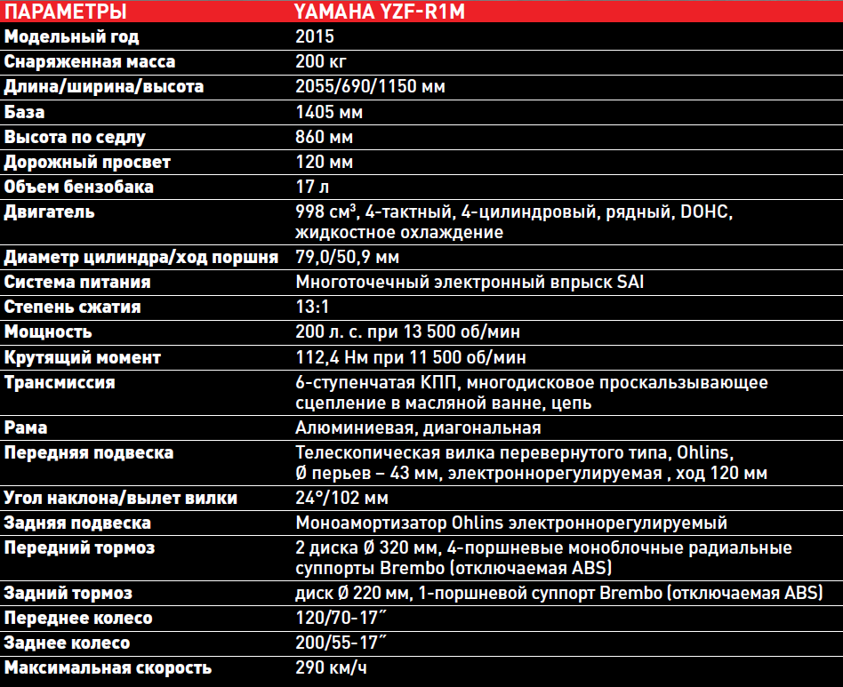 По управляемости YZF-R1M заметно интереснее BMW S1000RR, легче на перекладках, быстрее в шиканах, порой дает ощущение 600-кубового спортбайка, нежели тяжелого «литра». Думаю, компании Yamaha удалось вывести на рынок серьезного конкурента, и теперь позиции BMW S1000RR, всего трио «японцев», равно как и Aprilia RSV4 Factory, уже будут не столь сильны и безоблачны.