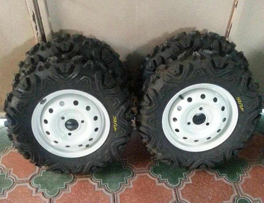 Следующая наша задача выбор колес. И идеальным вариантом не только в плане доступности, но и по размерам будут колеса от Оки. Главная особенность в том, что такие штампованные диски очень легкие, идеально впишутся в пропорции самодельного квадроцикла, а самое главное на них отлично подходит резина от заводских квадриков, которая значительно улучшит проходимость. Как это выглядит, можно увидеть далее:
