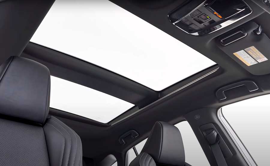 Панорамный люк на машине простирается от переднего до заднего ряда сидений, с помощью одного нажатия кнопки On/Off потолочное стекло может становиться прозрачным или матовым, позволяя находящимся в салоне получать дневной свет или быть защищенными от прямых солнечных лучей.
