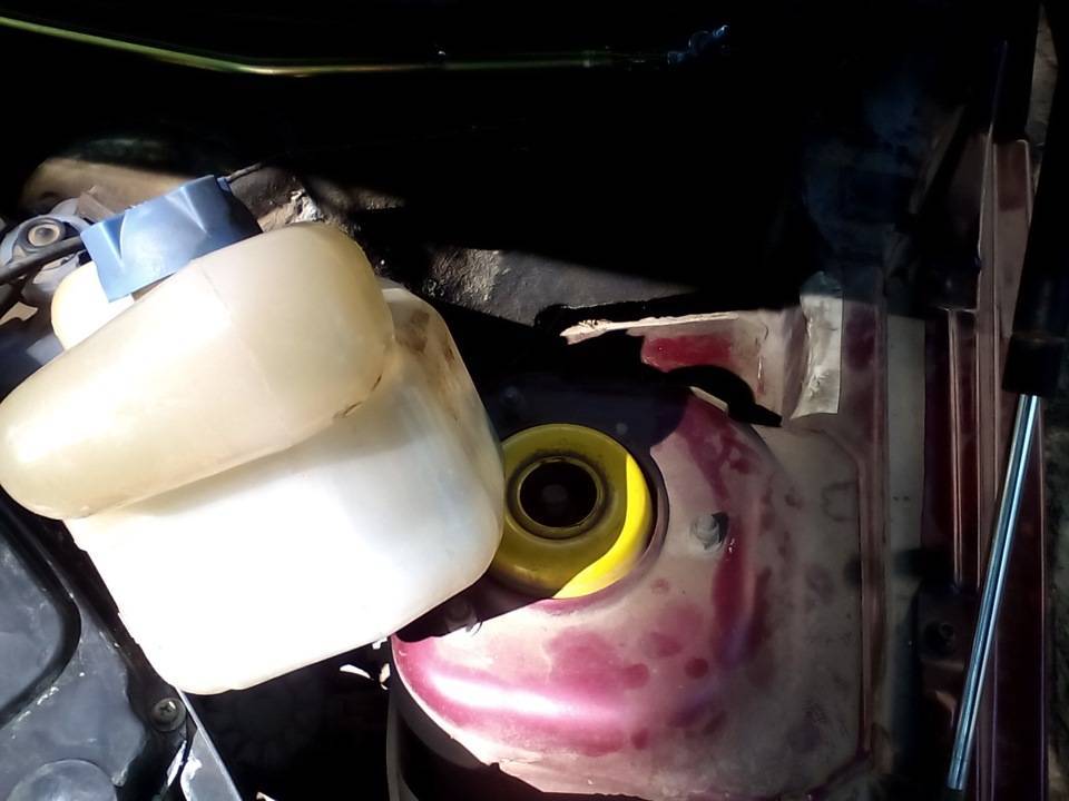 Поднимите расширительный бачок охлаждающей жидкости вверх и отведите в сторону. Шланги подходящие к бачку снимать не нужно.