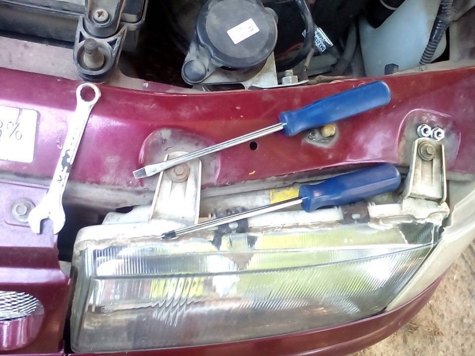 Снимите ремень, который поддерживает бачок радиатора и отодвиньте бачок в сторону. Затем вытащите перегородку (шумоизоляцию), которая расположена за бачком. Не забудьте вытащить из нее трубку подачи омывающей жидкости. Отсоедините электрические разъемы питания электромотора. После этого открутите болты крепления трапеции и электромотора. Чтобы извлечь трапецию, необходимо или долго мучиться, придумывая различные варианты, или подвести под дальний (относительно моторчика) конец нижней тяги трапеции тонкую плоскую отвертку и вытащите всю конструкцию как по салазкам. Также можно провернуть левый край трапеции по часовой стрелке и вытащить наружу, затем извлечь двигатель.