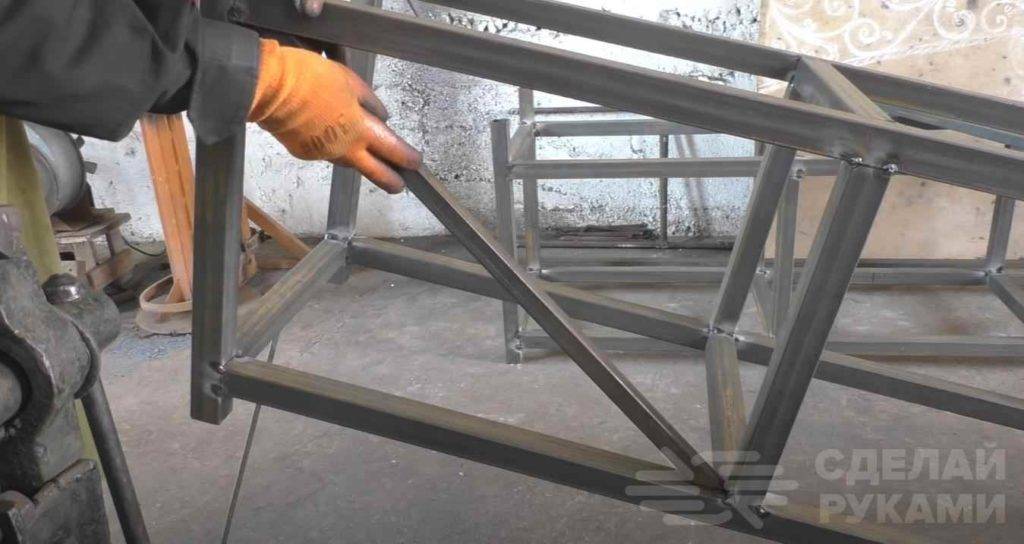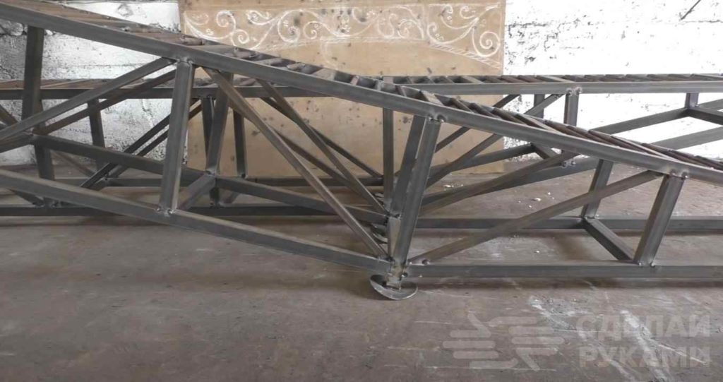 Для большей жесткости и прочности конструкции автор усиливает фермы укосинами, нарезанными из профильной трубы 25х25 мм.