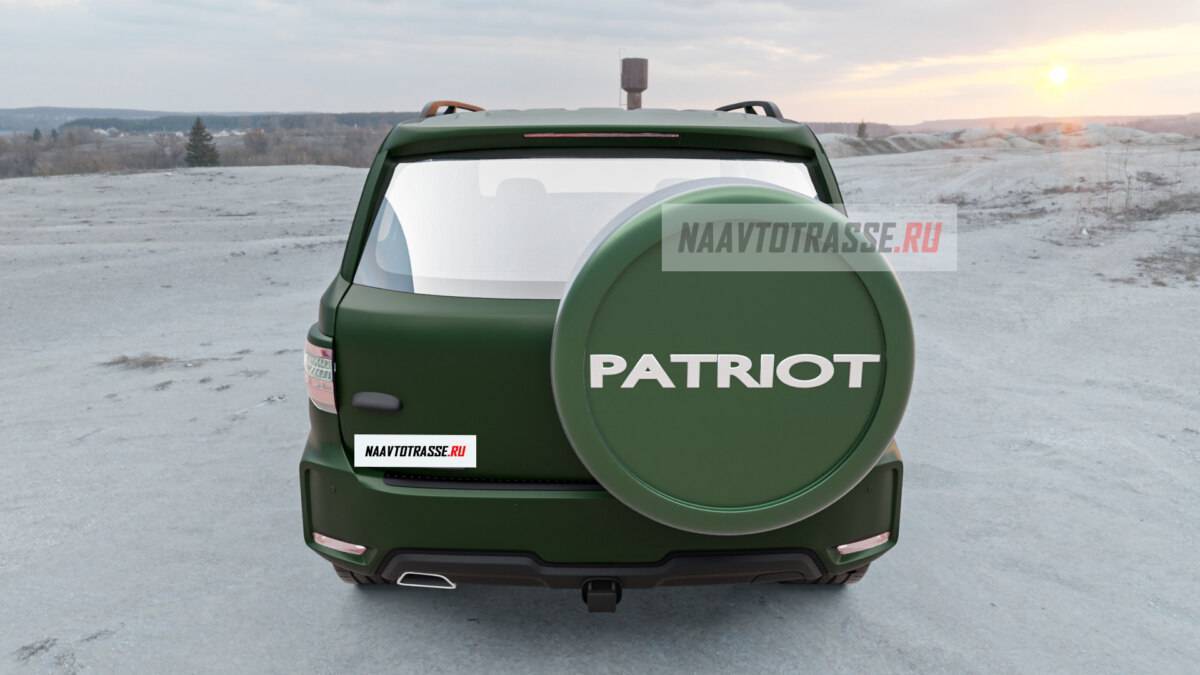 Внешне Патриот после последней модернизации не изменился. Автомобиль, как и ранее, укомплектован головной оптикой нестандартной формы с двухсекцонными галогенными огнями и пролегающей снизу лентой светодиодных ДХО. Передние фонари объединены с многоугольной решеткой радиатора, обрамленной металлическим кантом и «заполненной» мелкой сеткой. Ниже от нее закреплен достаточно крупный бампер с компактным воздухозаборником и расположенными по бокам нишами, в которые встроены противотуманные фары. Линия крыши идет параллельно дорожному полотну и переходит под углом в 90 градусов в корму, из-за чего кузов внедорожника приобретает квадратичную форму. Сзади у российской модели крепится полноразмерное запасное колесо, закрытое защитным кожухом из пластика. Кормовые фонари встроены в опорные стойки и частично заходят на боковую часть кузова.