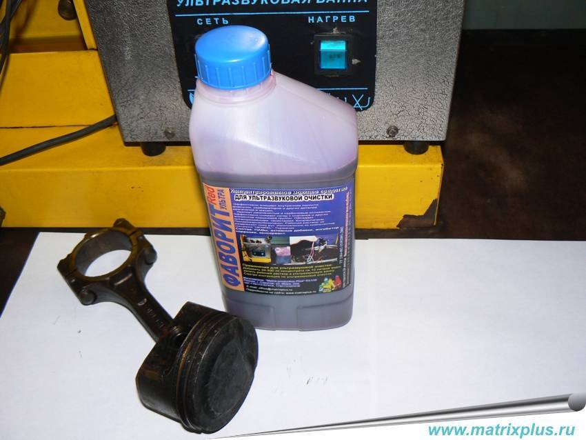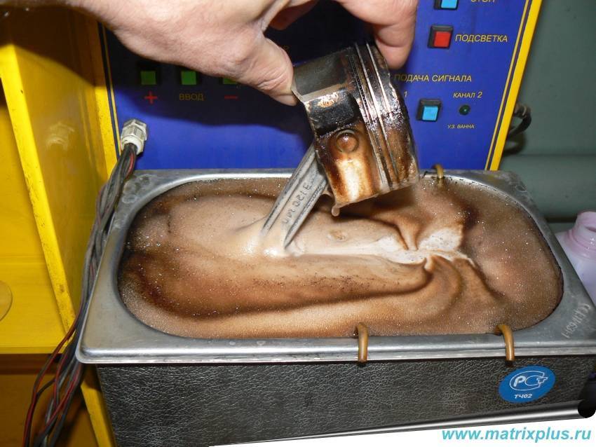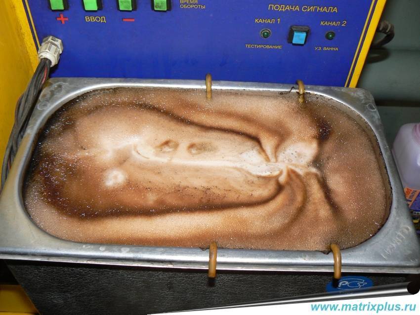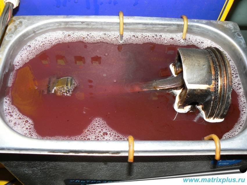 Суть этого способа заключается в том, что очищаемый предмет (в случае с ДВС речь идет о деталях двигателя) помещается в емкость с жидкостью. В качестве такой жидкости может быть просто вода или раствор моющего средства.