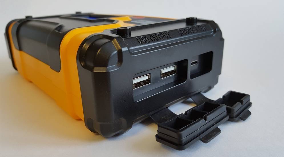 Два разъема USB, прячущиеся под резиновыми крышечками, позволяют заряжать смартфоны и планшеты – причем довольно быстро, поскольку выходной ток может достигать 2,4 ампер. А расположенный рядом с ними разъем заряда самого бустера – всего-навсего microUSB. Однако его силенок более чем достаточно – разряженный на 50% аккумулятор бустера двухамперный USB-адаптер наполняет до 100% примерно за пару часов.