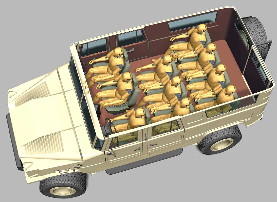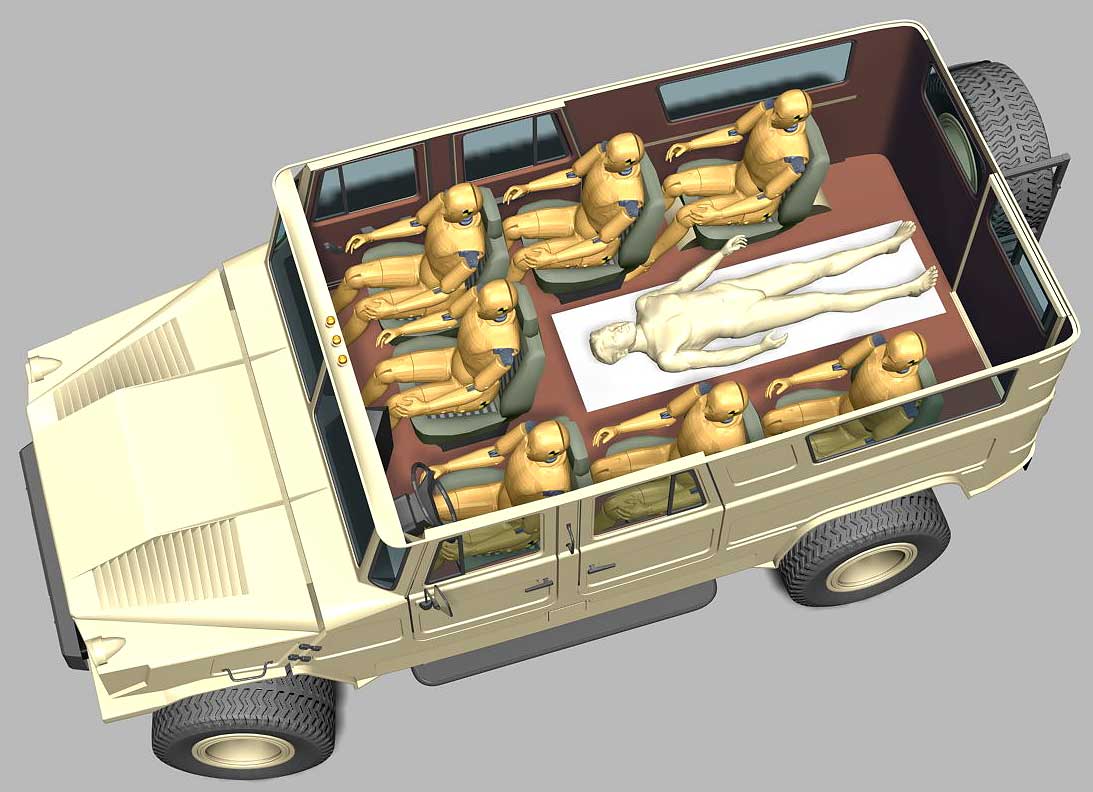 Основные из них: вместимость не меньше 6 человек (без использования дополнительных сидений), снаряженная масса автомобиля не должна превышать 3000 кг; рабочий объем и мощность штатного двигателя должны быть не меньше 4л и 150 л\с соответственно; обязательно наличие независимой подвески всех колес и колесных редукторов.