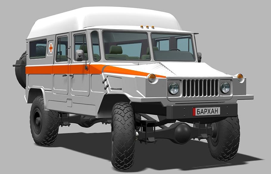 Возможен вариант кузова и без верхней надстройки и специального оборудования. Этот «Бархан» используется как машина дополнительного медицинского сопровождения. Равно как и все версии, машина может быть оснащена «подкачкой» колес и лебедкой.