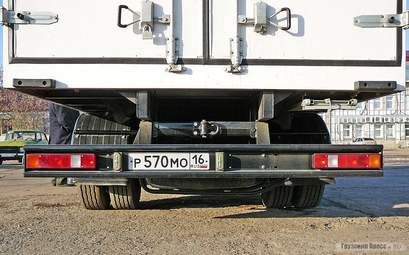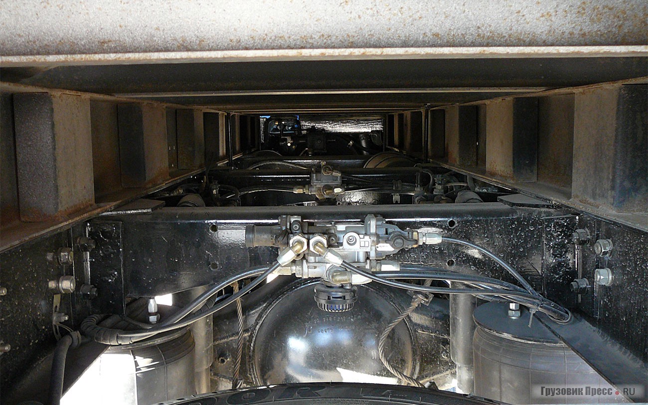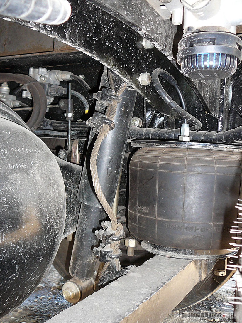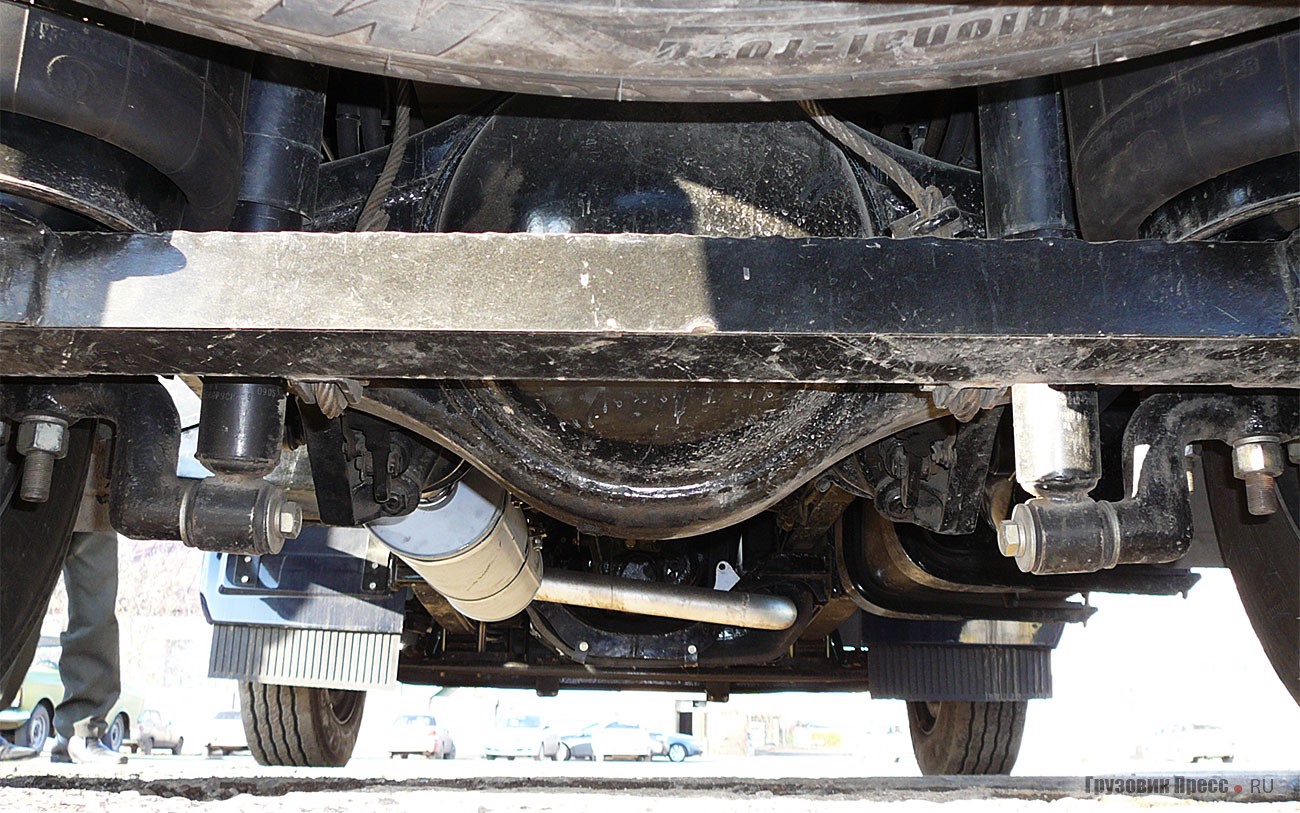 Так, базовой комплектацией считается пневмоподвеска заднего моста с деформируемыми рычагами и ограничителями поперечного смещения, дополненная амортизаторами. Это сделано для того, чтобы при необходимости можно было изменять величину дорожного просвета. Хотя как опция возможна установка и рессорной подвески. Кстати, в рабочем положении расстояние между дорогой и креплением амортизатора всего 180 мм.
