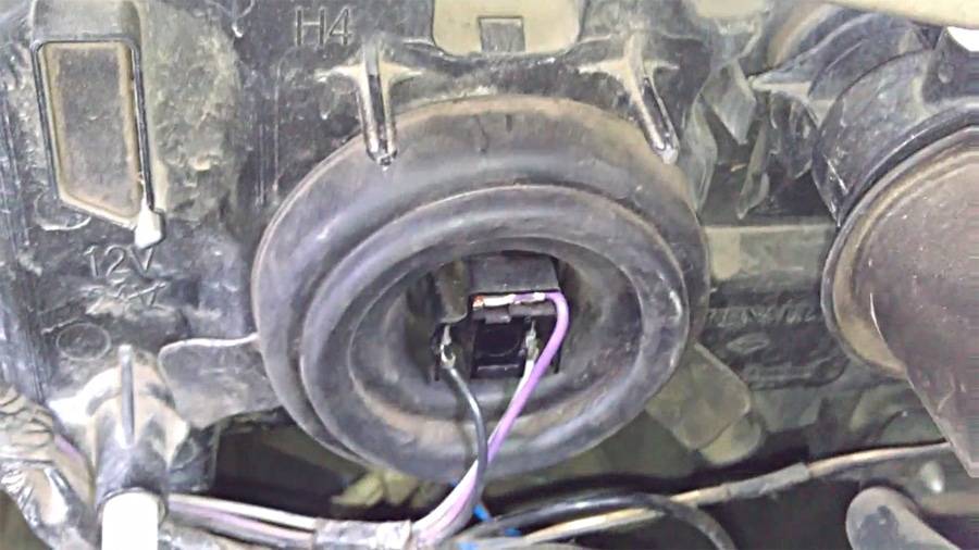 Когда мы удалили пластиковую крышку, мы видим резиновый уплотнитель и колодку с проводами, которая подключена к лампочке. Сначала следует аккуратно вынуть колодку, держать при этом её необходимо только за корпус, а затем и сам уплотнительный чехол.