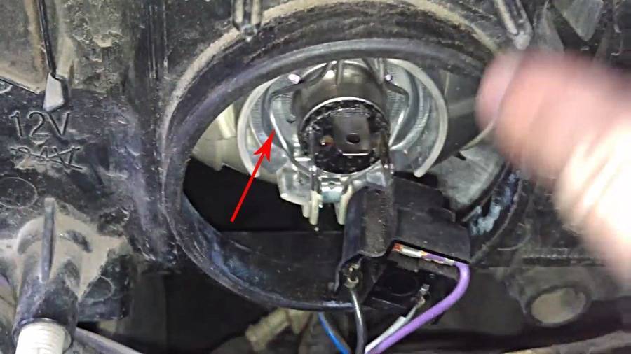 Перед нами лампочка, прижатая пружинным фиксатором. Я его пометил стрелкой.