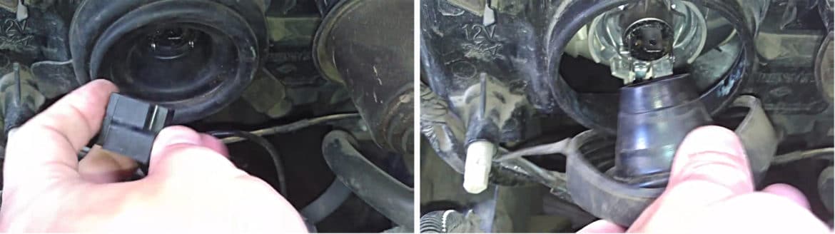 Снимаем резиновый уплотнительный чехол (для наглядности показано на снятой блок-фаре).