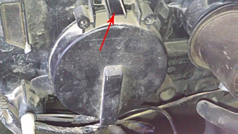 После того как АКБ была убрана со своего места мы видим соответственно саму блок фару, по центру которой установлена пластиковая крышка, с фиксатором сверху. Чтобы убрать это крышку и добраться непосредственно к лампочке надо надавить большим пальцем одной руки на своеобразную лапку (фиксатор), и одновременно снизу вытянуть крышку на себя. Так как пластик достаточно податливый, никаких сложностей в этом процессе возникнуть не должно.