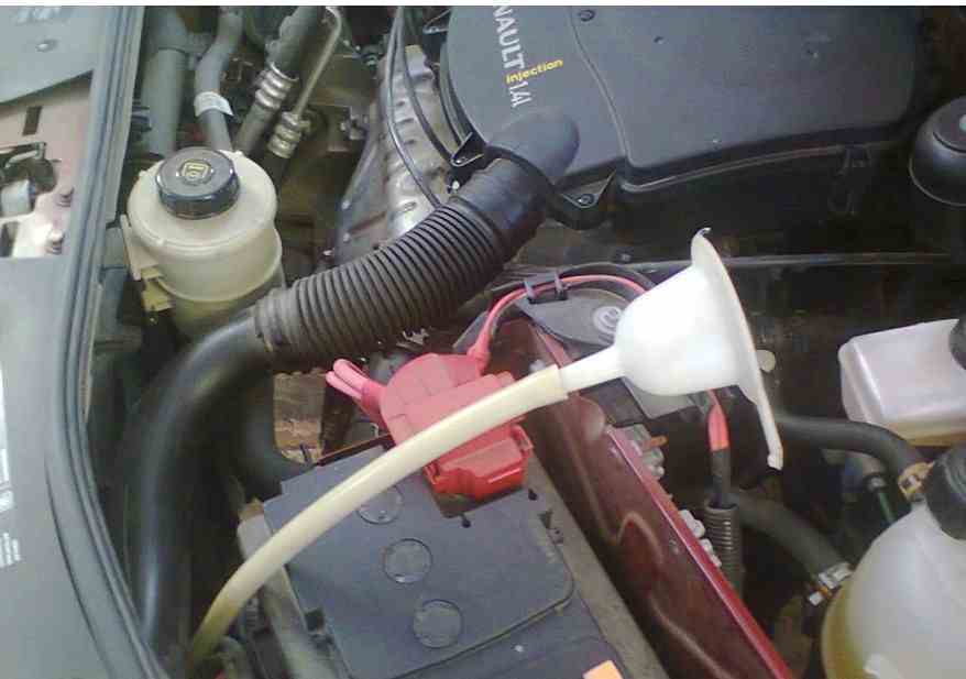 - Воткнуть в заливное отверстие шланг от нагнетателя либо воронки. Если употребляется воронка, то её шланг опускается из подкапотного места.