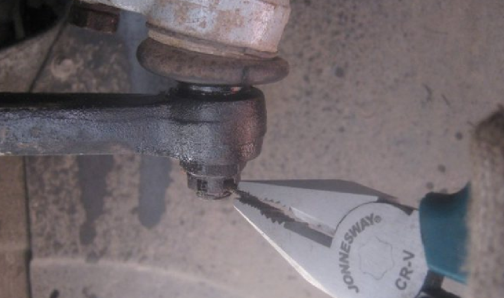- Вынимаем фиксирующий шплинт. Вынимаем шплинт с рулевого наконечника