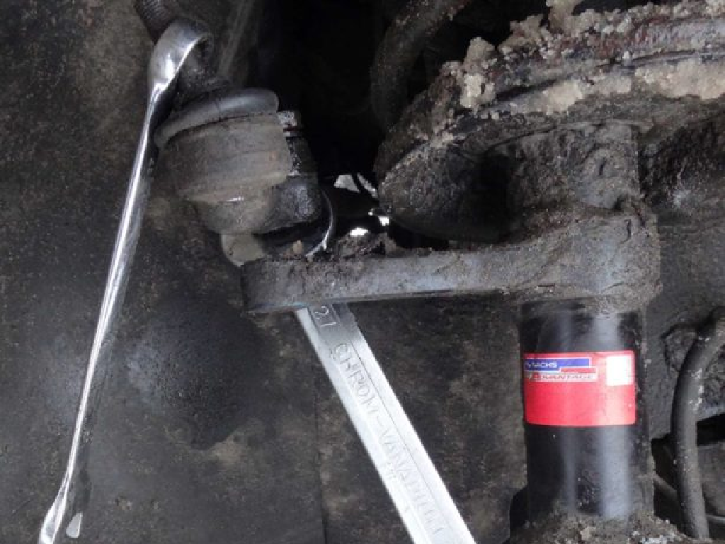 - Рожковым ключом ослабить контргайку рулевого наконечника. Вывернуть руль в противоположную сторону и с помощью гаечного ключа или головки открутить рулевой шаровый палец.