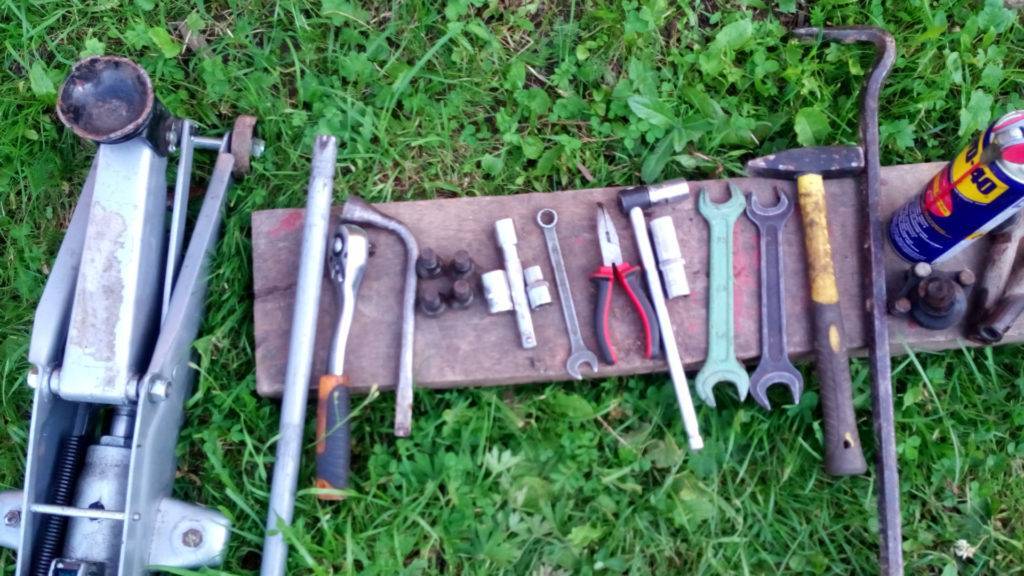 Теперь, перейдем непосредственно к вопросу замены. Для начала необходимо собрать необходимый инструментарий. Что же пригодиться в процессе: домкрат, набор ключей (19, 24, 27), баллонный ключ, монтировка и молоток, ВД-40. Когда все необходимое собрано, покупаем новые наконечники и переходим к процессу замены: