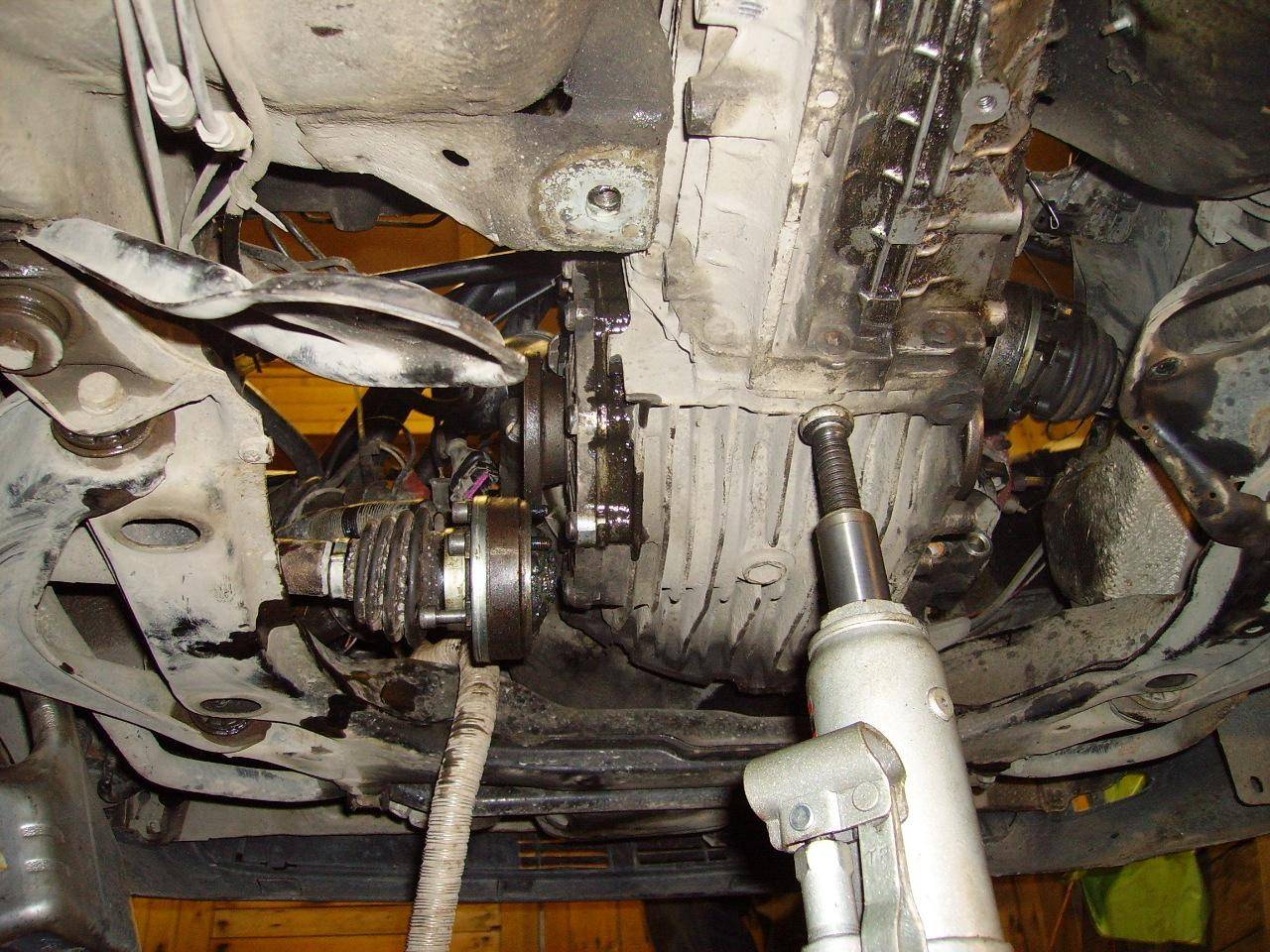 Купил комплект сцепления: диск сцепления, корзина и выжимной. Все фирмы Sachs. И сальник номер который мне благополучно дали уважаемые соклубники на сайте, за что я им ооочень благодарен!С моим лучшим другом поехал в гараж, загнал машину на яму и началось.Открутил все болты. Перед самым моментом снятия поставили домкрат. Приводные валы привязал проволокой, чтобы не мешались.