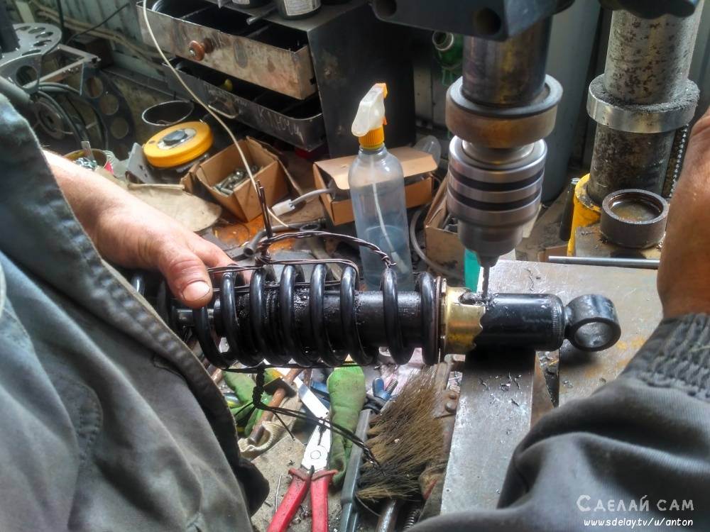 как видно на фото амортизатор и пыльник в масле. Стойка не рабочая. Хотели снять пружину через низ, высверлив упор регулировочного кольца, но потом сняли через верх.